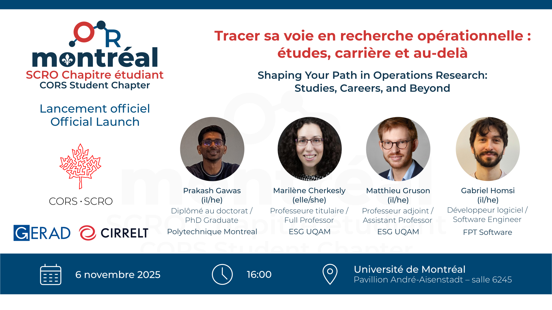 Le Chapitre étudiant montréalais de la Société canadienne de recherche opérationnelle (SCRO) organise son événement de lancement : « Tracer sa voie en recherche opérationnelle : études, carrière et au-delà », le 6 novembre 2025 à 16 h, à l’Université de Montréal (Pavillon André-Aisenstadt, salle 6245).